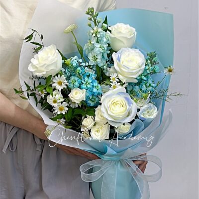 Blue (color-sprayed) Roses, baby Roses with blue-color dyed Matthiola & other white seasonal side fillers (Pre-Order)