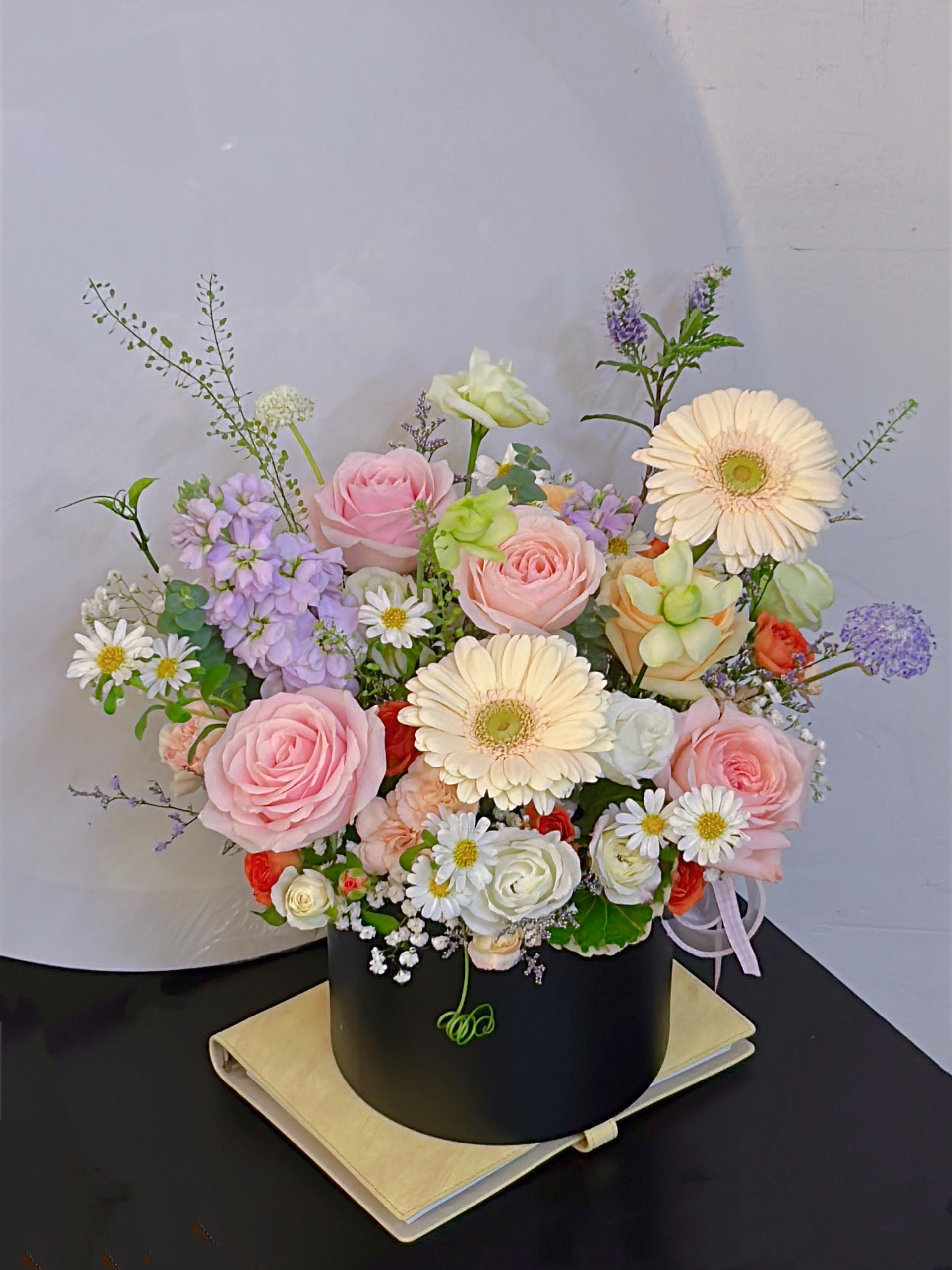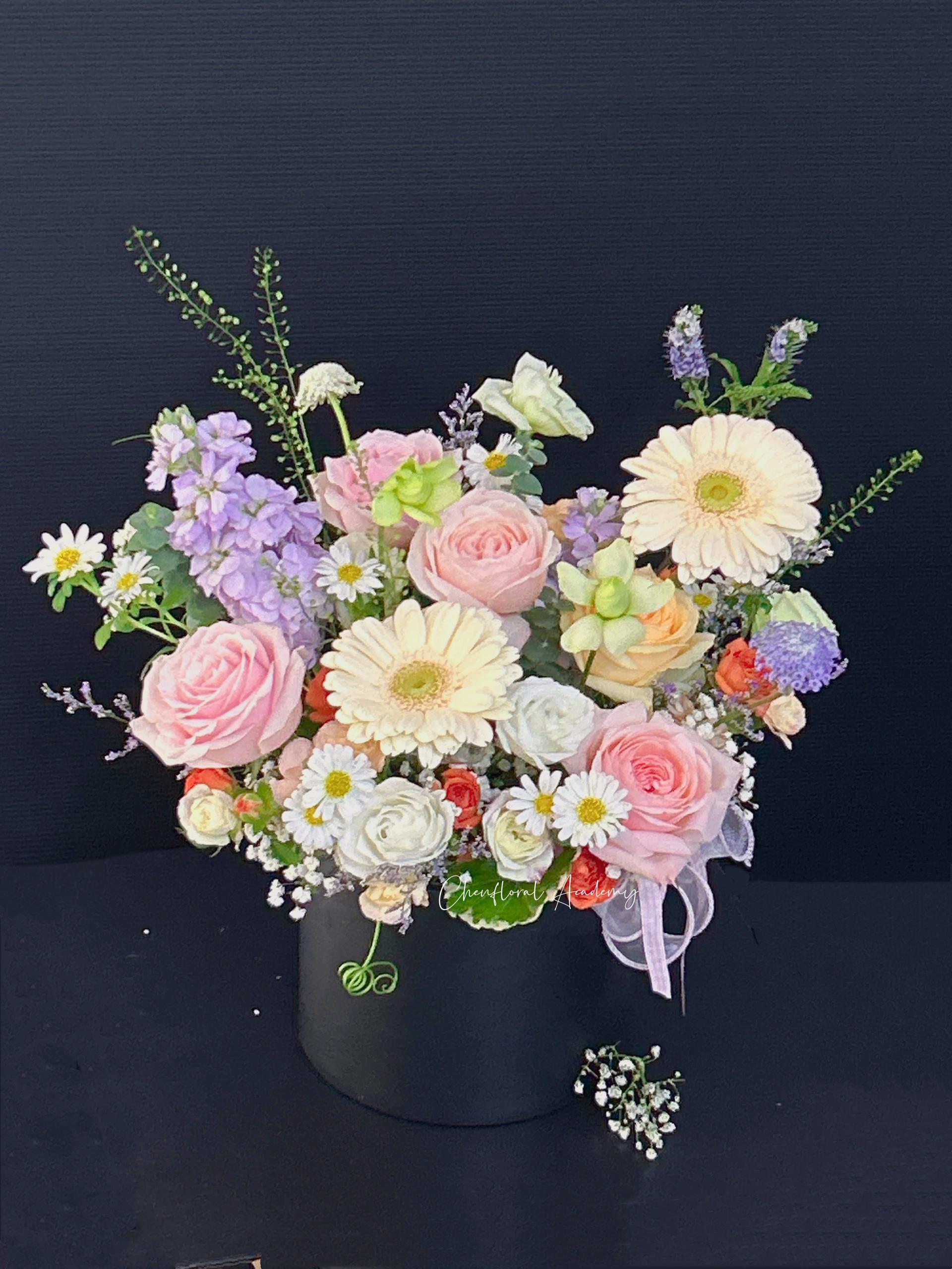 ⓘ Combination of flowers materials (such as flower colors, side fillers) / box color used may vary from picture displayed. Florist will randomly select, mix & match as close to the color theme based on current season stock availability at equal or higher value, without prior notice.