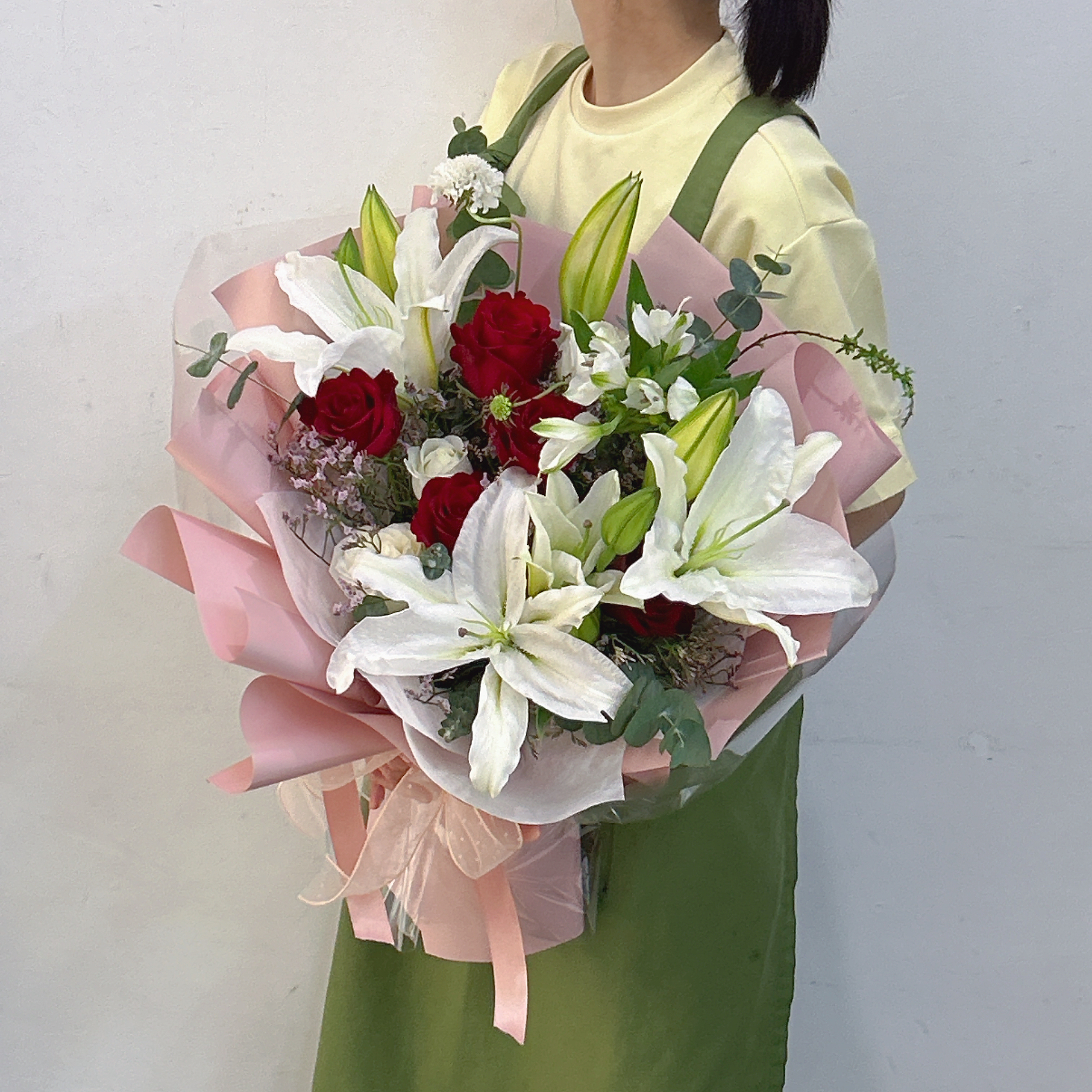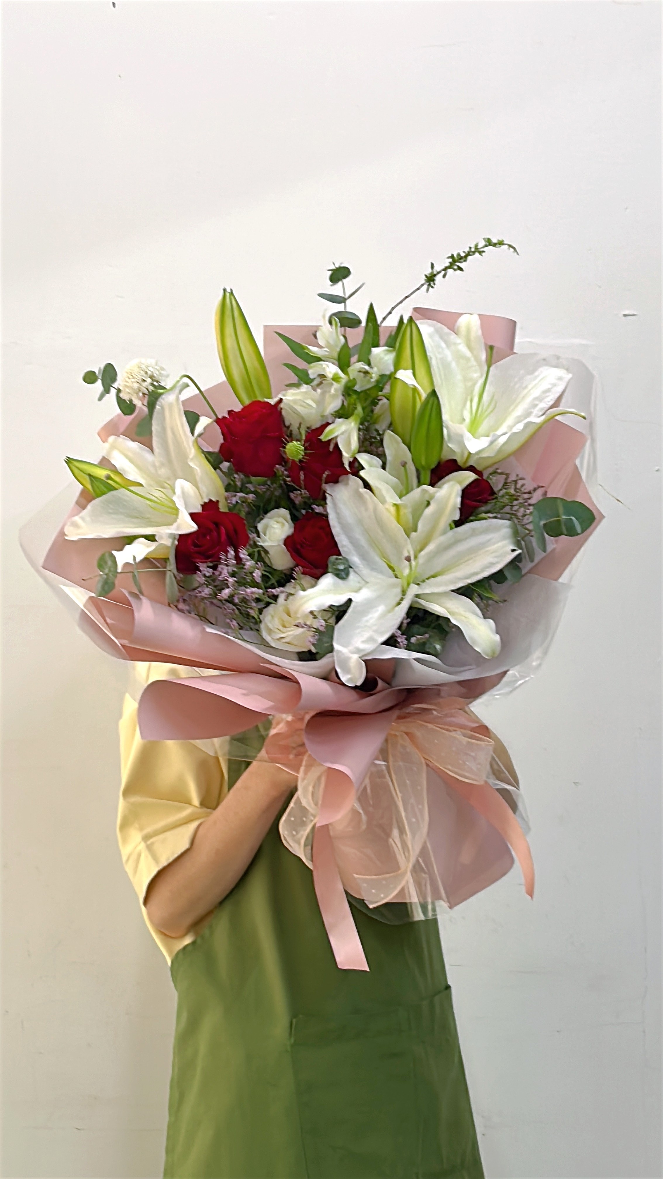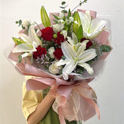 Return To ShopMix bouquet of 3’s Lilies with 7’s Red & White Roses, side fillers & foliage (Pre-order)