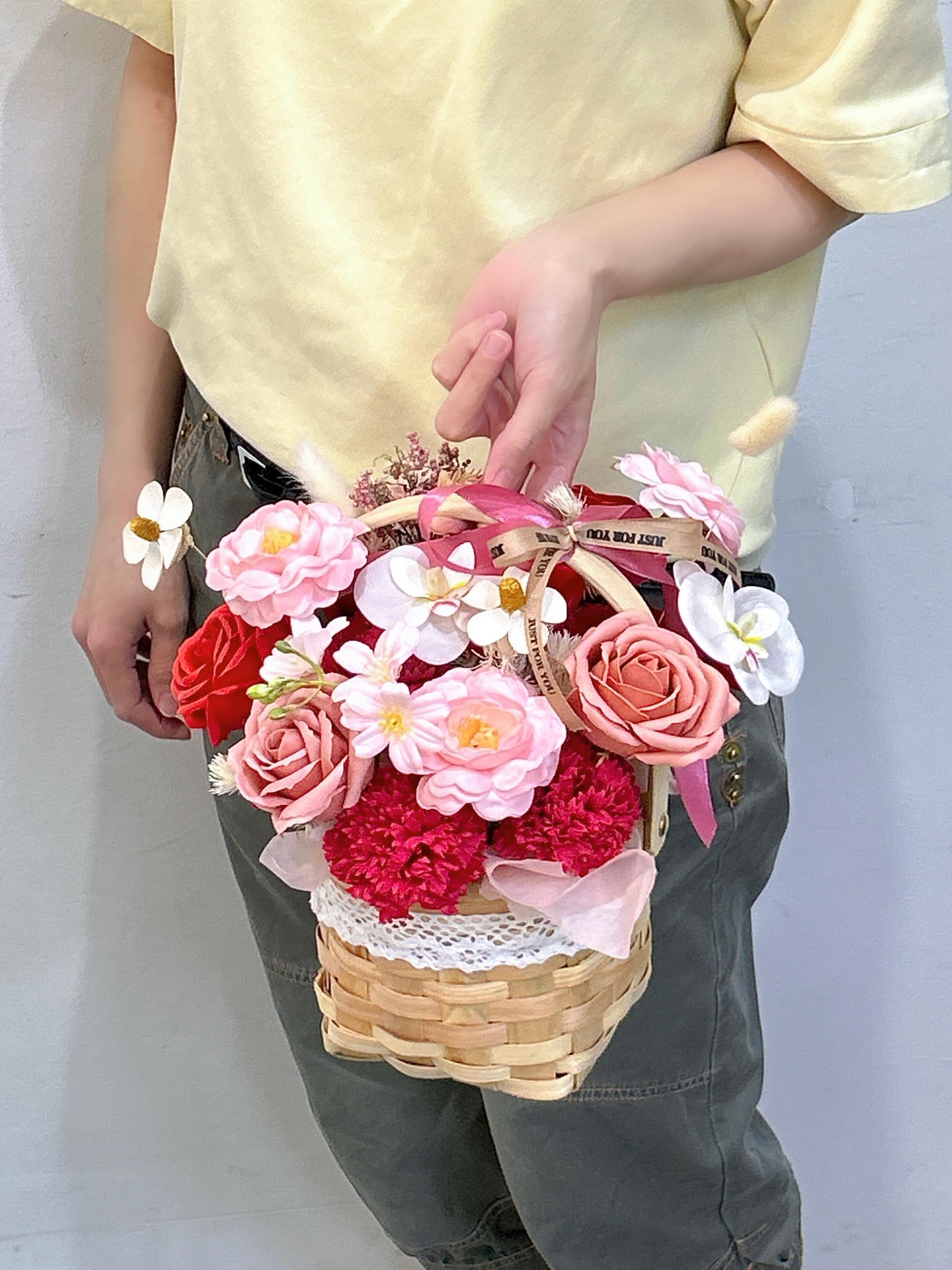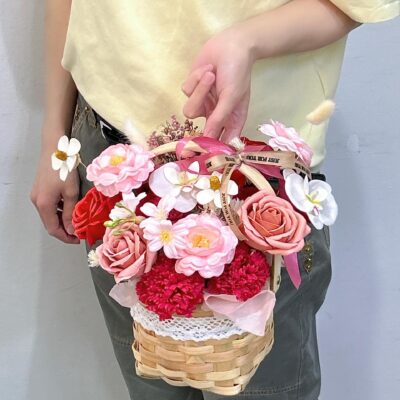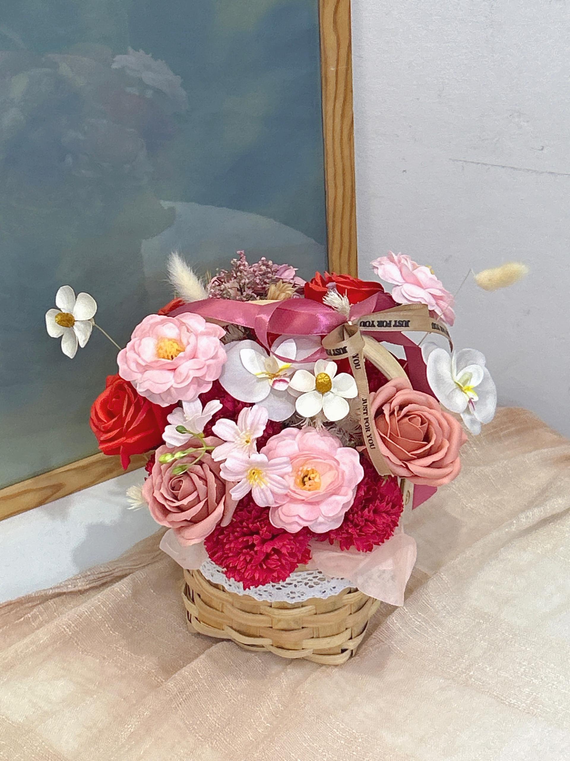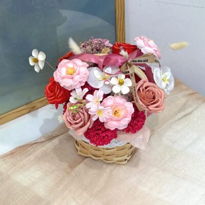 A small mix soap flowers basket consists of Pink Peonies, Red & Cappuccino Roses, Red Carnations, White Orchids, matched with dried preserved side fillers (Ready Stock x 1 unit only)
