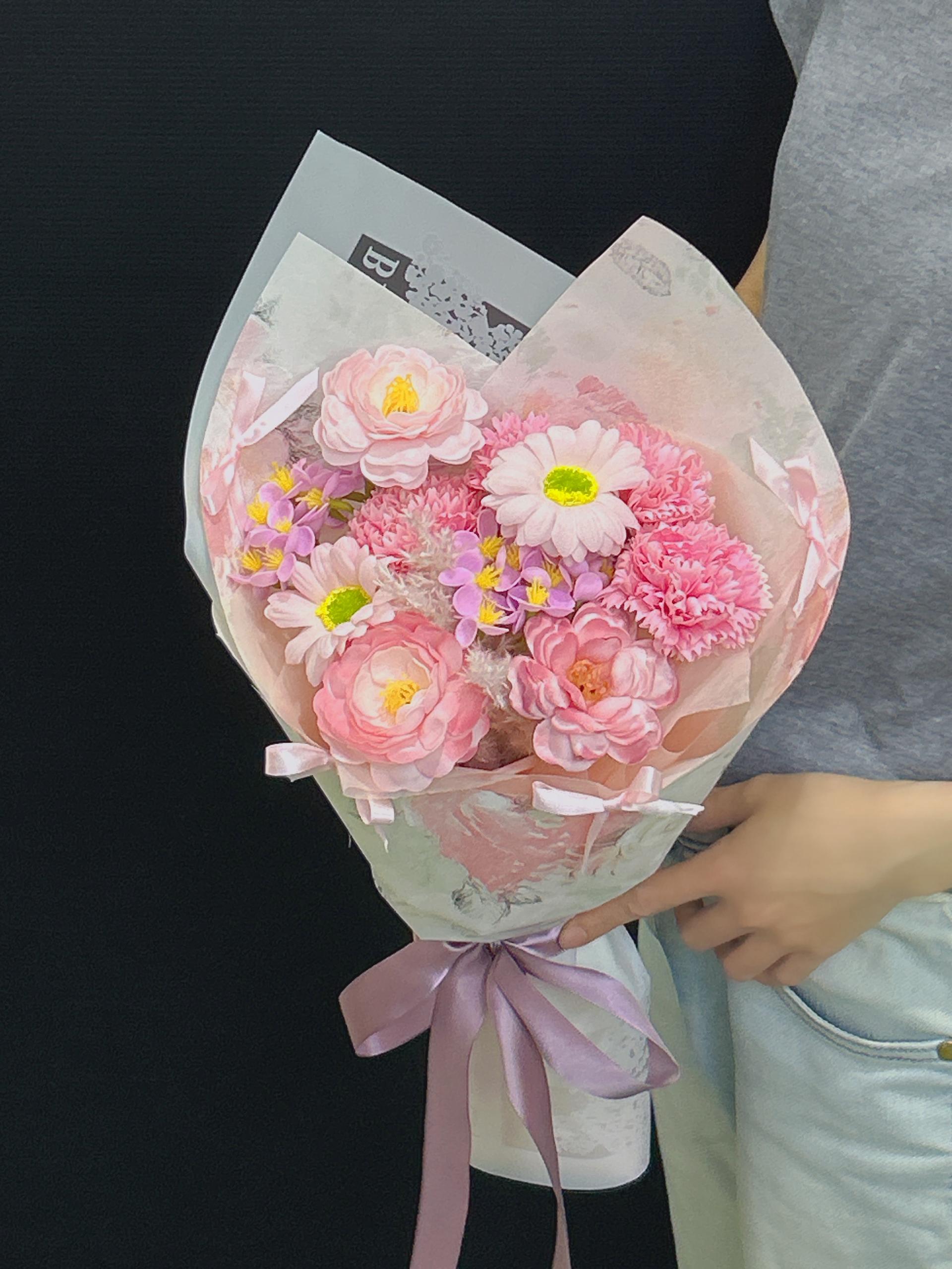 A small mix soap flowers bouquet consists of Pink Peonies, Pink Carnations, Pink Gerbera, Purple-Pink Hydrangea matched with side fillers (Ready Stock x 1 unit only)